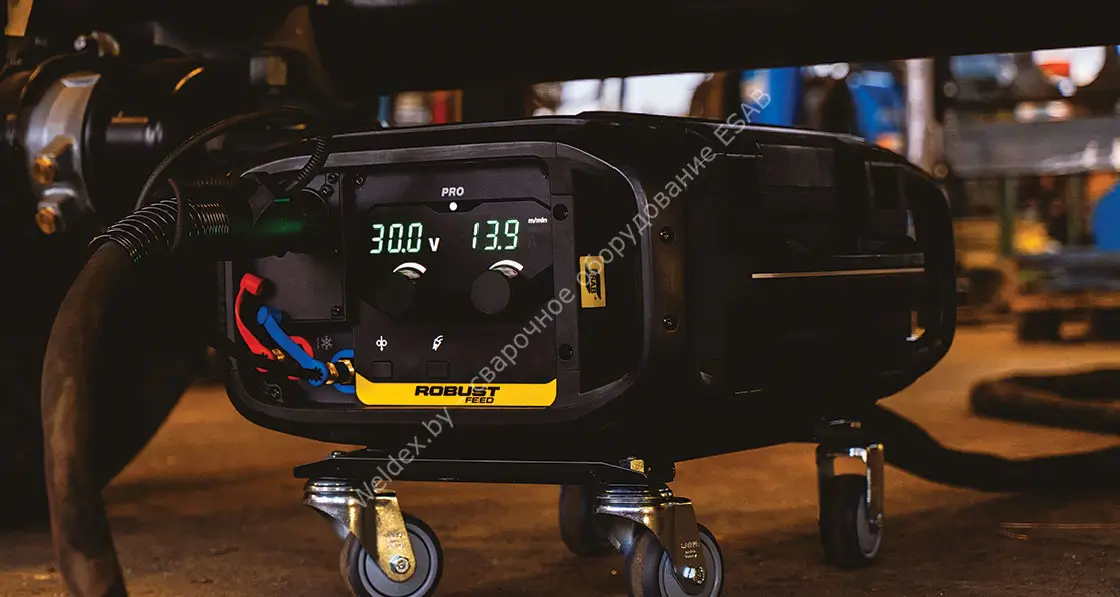 Выполненный из алюминия, осуществляет подачу сплошной сварочной проволоки диаметром до 2,0 мм и порошковой проволоки до 2,4 мм со скоростью 0,8-25,0 м/мин. При замене катушки можно поменять проволоку, не открывая механизм подачи проволоки. RobustFeed легко справляется с 550 А при ПВ 50%, 500 А – при ПВ 60% и 400 А – при ПВ 100% и обеспечивает производительность, на которую способны лишь некоторые модели других устройств подачи проволоки.
